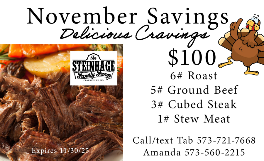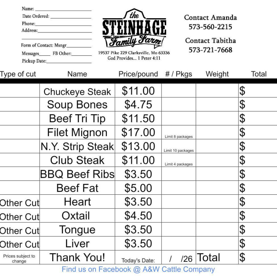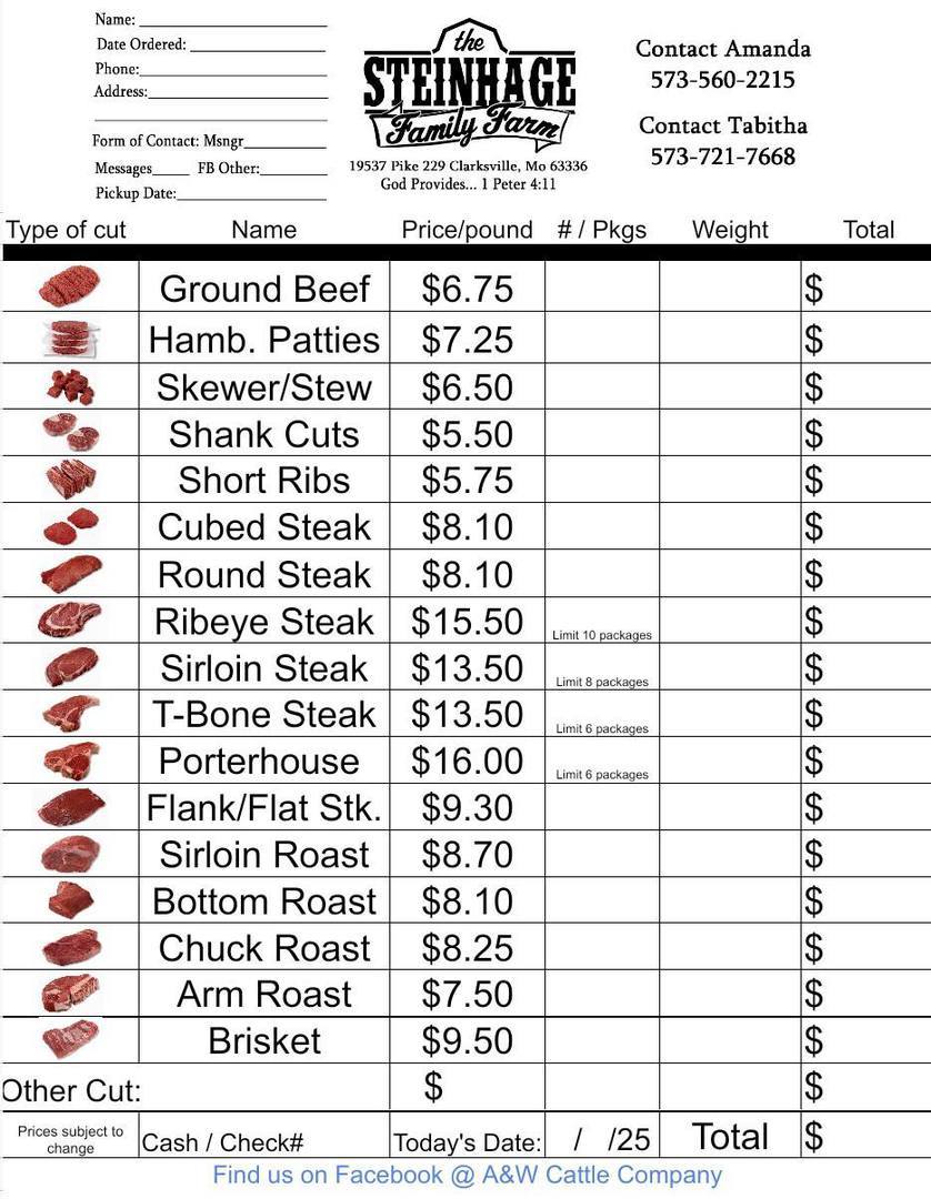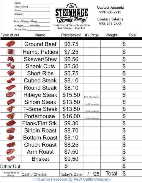 Yes! You can purchase one cut of meat or order a whole beef if you desire. Call or text your order to Tab (573) 721-7668 or Amanda (573) 560-2215